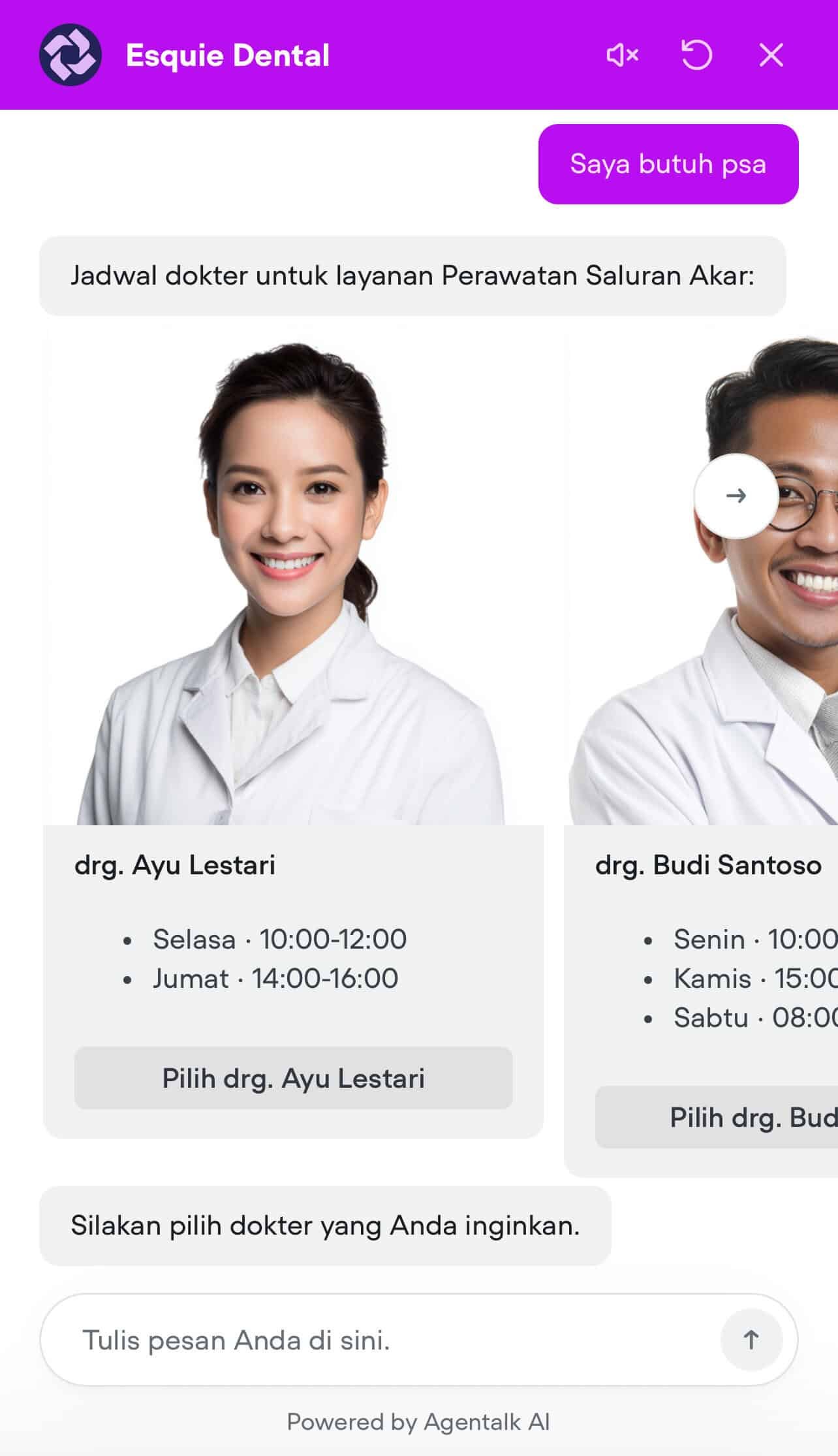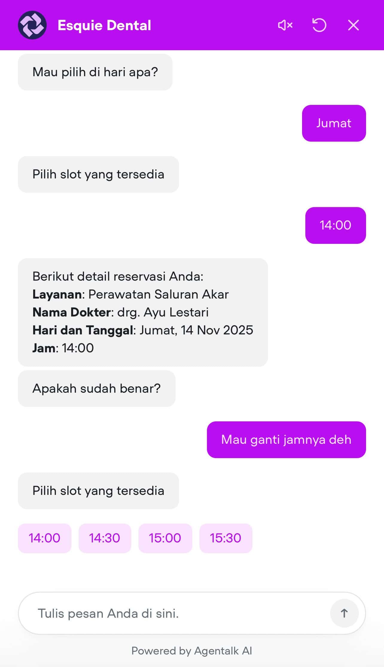 Agentalk AI adalah sistem reservasi otomatis 24/7 yang dirancang khusus untuk klinik gigi.