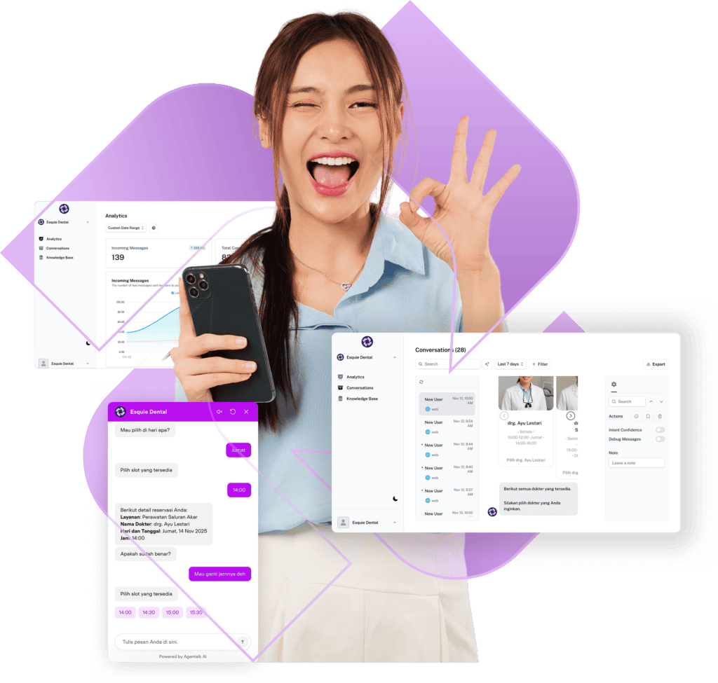 Agentalk AI: Meringankan kerja admin, 80% task sudah auto-handled. Kami buat dashboard khusus untuk admin yang memudahkan create-update-check jadwal, dari dokter sampai pasien (walk in dan online reservation).